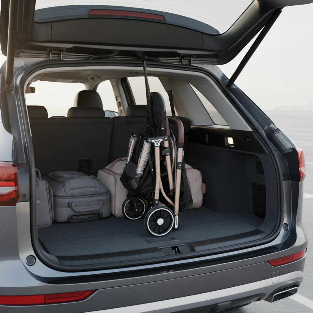 • الأبعاد (مطوية): مدمجة جداً عند الطي، مما يسمح بوضعها في شنطة السيارة أو في مقصورة الطائرة.