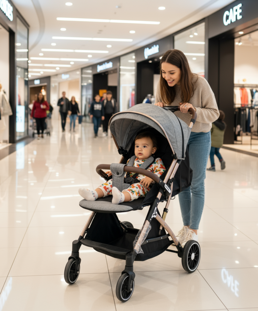 • القماش: قماش عالي الجودة بلون رمادي فاتح للمقعد والمظلة، مع تفاصيل باللون الأسود.
